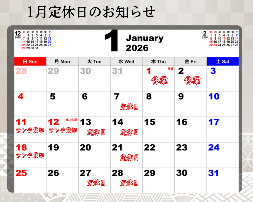 最大20名様でくつろげる お座敷で貸切可能。 法事などの際には季節の食材や 採れたての地魚を盛り込んだ 和食のコース料理もご用意できます。 ご利用の際は事前予約をお願いいたします。