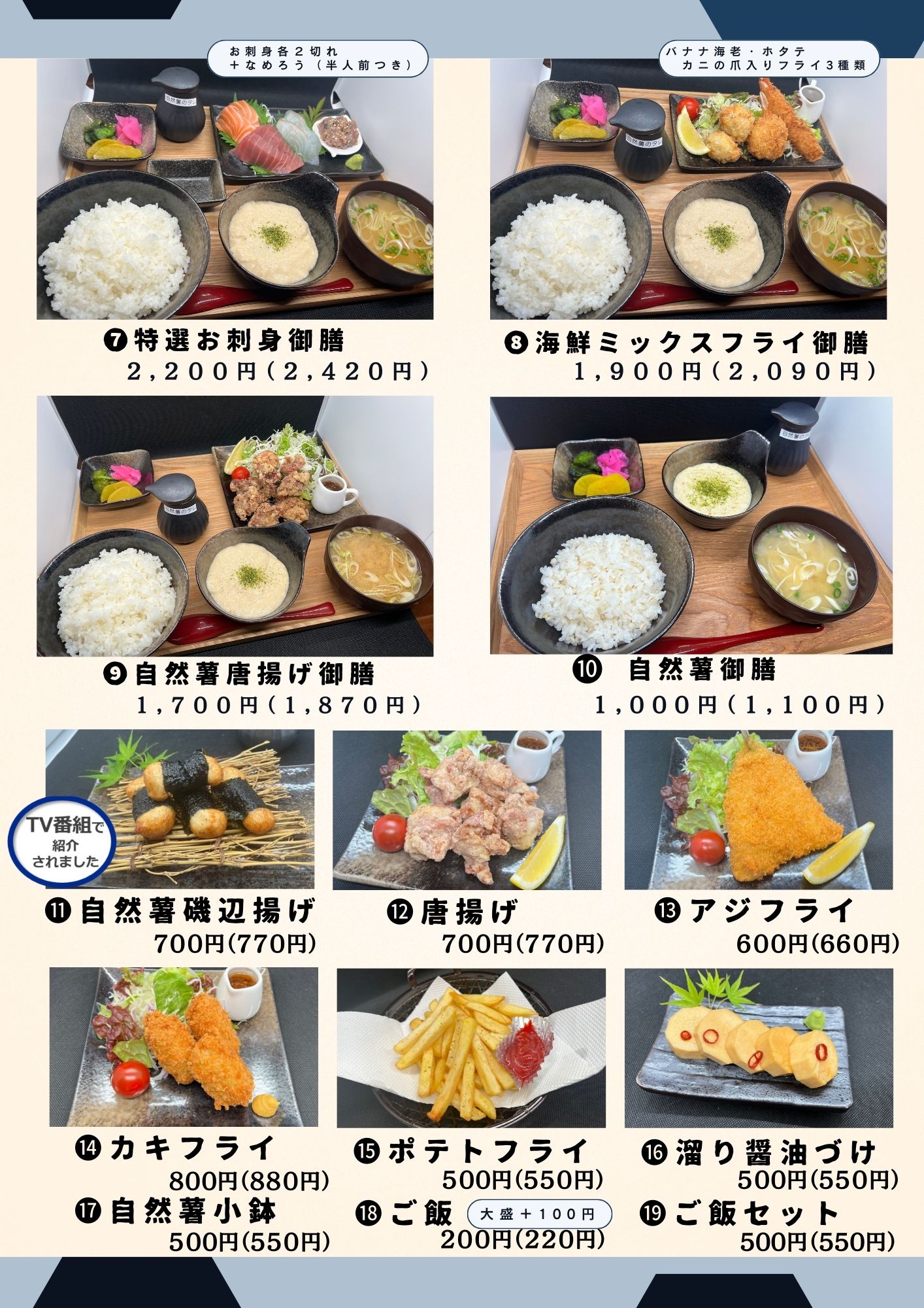 有機肥料100%栽培 こだわりの自然薯定食をご用意 「山薬」「山うなぎ」とも呼ばれるほど 栄養価の高い自然薯料理と 房州産の新鮮なお刺身を中心としたお食事をお楽しみください。